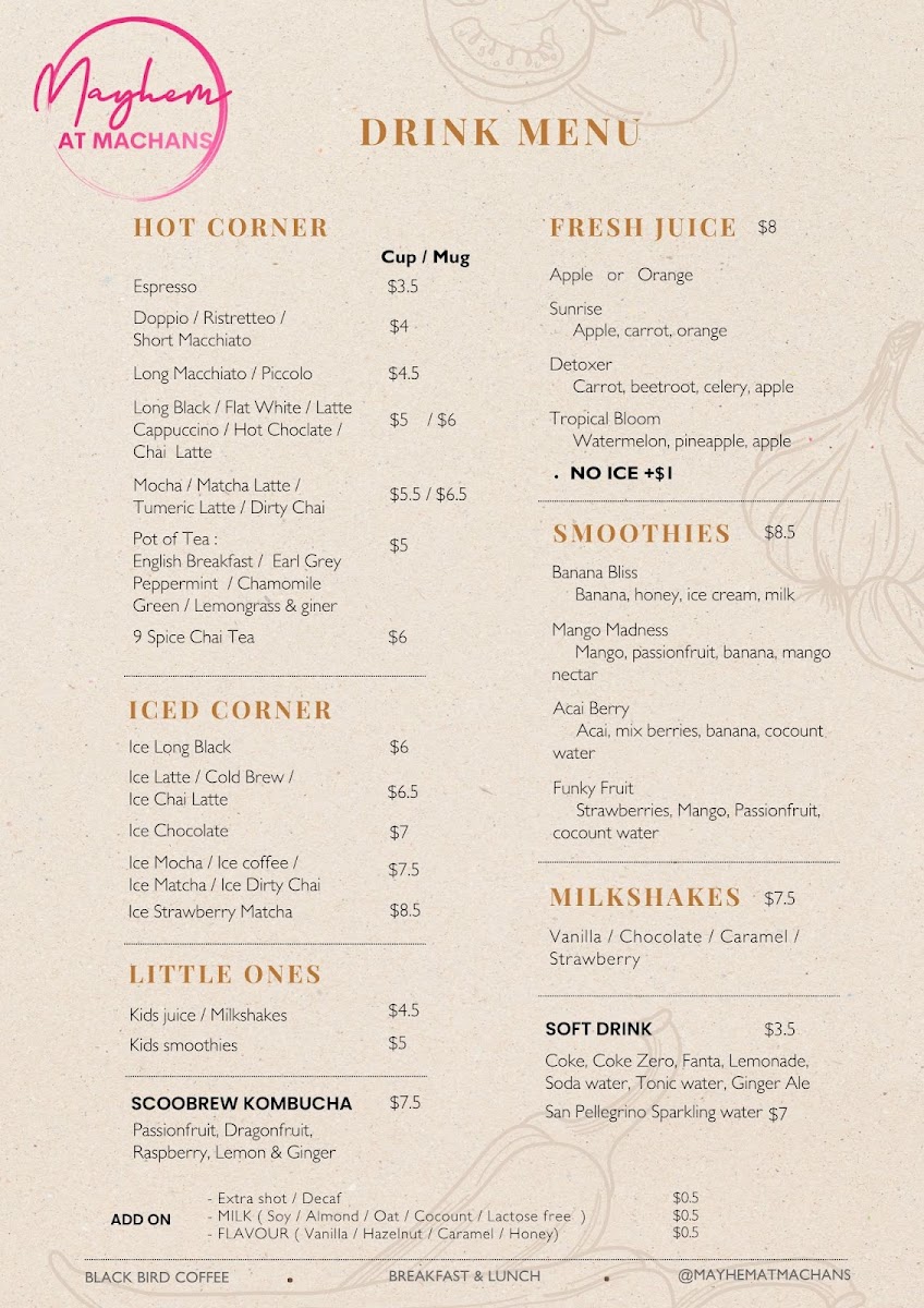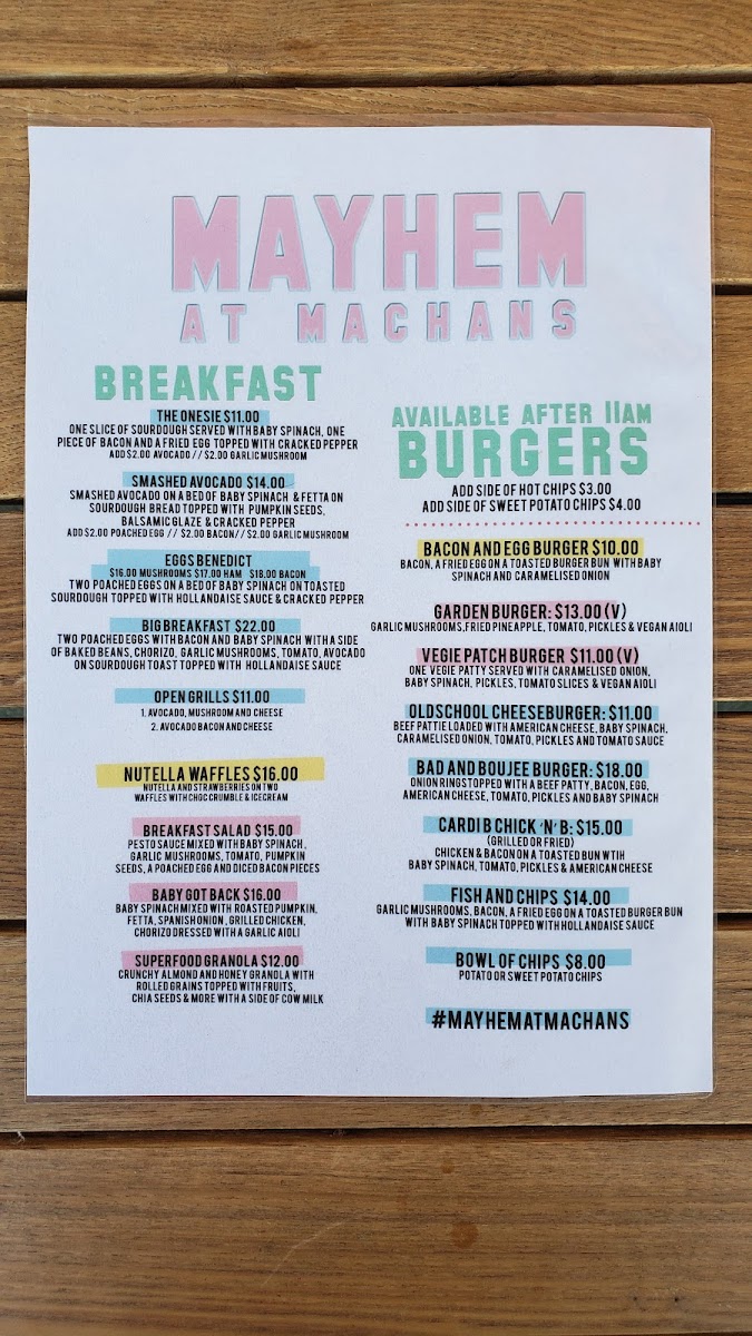 The drinks selection enhances the menu further, featuring refreshing iced beverages such as Ice Long Black and Ice Matcha, alongside craft beers and ciders for the adults. Little diners are also catered for, with appealing juices and smoothies just for them. Customers appreciate the friendly service and the café’s inviting atmosphere, whether indoor or outdoor. The breakfast options are particularly noteworthy, with unique choices like pumpkin dishes surprising patrons with their deliciousness. Overall, Mayhem At Machans offers a perfect blend of quality food, excellent coffee, and a welcoming environment.